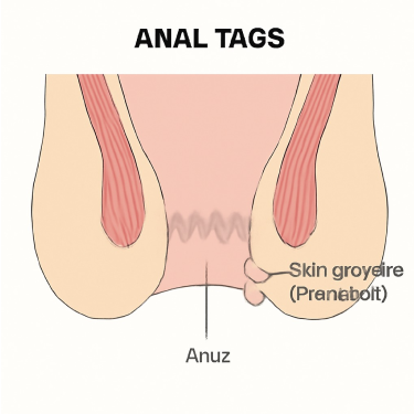 Anal tags are harmless skin flaps around the anus, usually resulting from healed fissures or hemorrhoids. Though painless, they may cause hygiene problems or irritation. They can be removed surgically for comfort or cosmetic reasons.