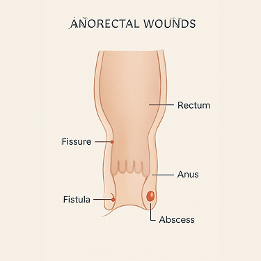 These include injuries or ulcers in the anal or rectal area caused by trauma, infections, or surgical complications. They may result in pain, bleeding, or infection. Proper wound care, antibiotics, and follow-up are essential for healing.