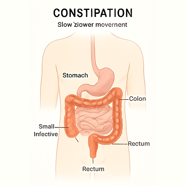 Constipation is defined by infrequent, difficult, or painful bowel movements. It may lead to straining, hard stools, and complications like fissures or piles. Causes include low fiber intake, dehydration, or lack of activity. Regular bowel habits and lifestyle changes are key.
