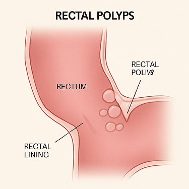 Polyps are growths on the inner lining of the rectum that can be benign or pre-cancerous. Often symptomless, they may occasionally cause bleeding. Colonoscopy helps detect and remove them early to prevent colorectal cancer.