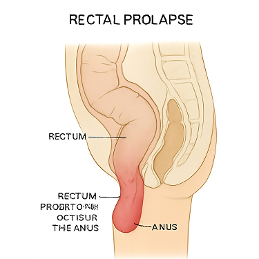 A condition where part of the rectum slips out of the anus, seen more in elderly or chronically constipated patients. Symptoms include visible bulging, mucus leakage, and discomfort. Surgical repair is usually required for lasting results.