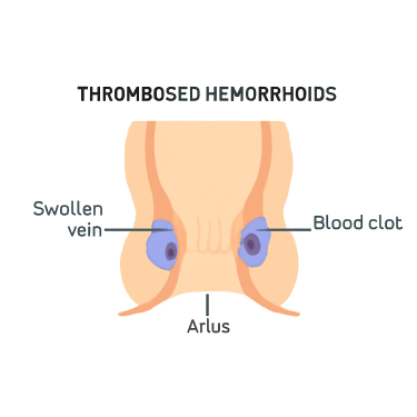 These are external hemorrhoids where a blood clot forms inside, causing severe pain, swelling, and a bluish lump. If untreated, they may burst or cause infection. Treatment may include pain relief, clot removal, or surgical excision in serious cases.