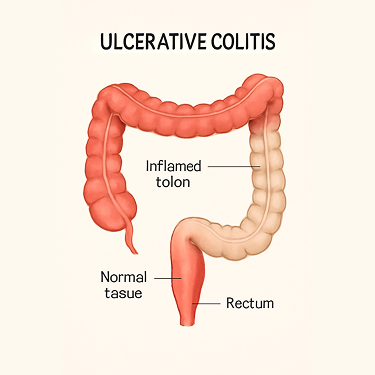 A chronic condition that causes inflammation and ulcers in the inner lining of the colon and rectum. Symptoms include bloody diarrhea, abdominal cramps, and fatigue. It requires long-term management through medication, diet control, and sometimes surgery.